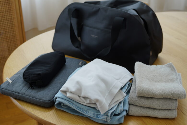 服1セット、タオル3枚、ポーチ、PCを入れてもまだスペースがありました。開口部が大きく、底面がしっかりしているので荷造りがラク。