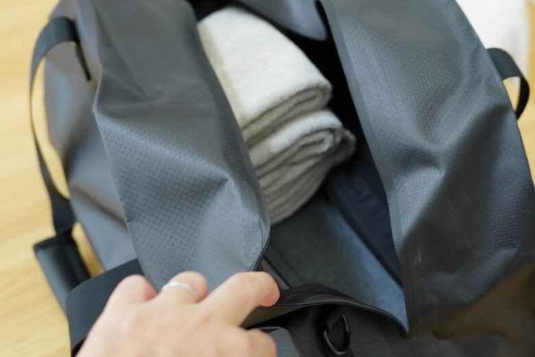 防水バッグの多くは構造が硬く、開けにくさが弱点になりがちですが、これは防水性と操作性のバランスが上手く取れている印象です。小さなことのようで、日常的に使うと快適さに差が出ます。